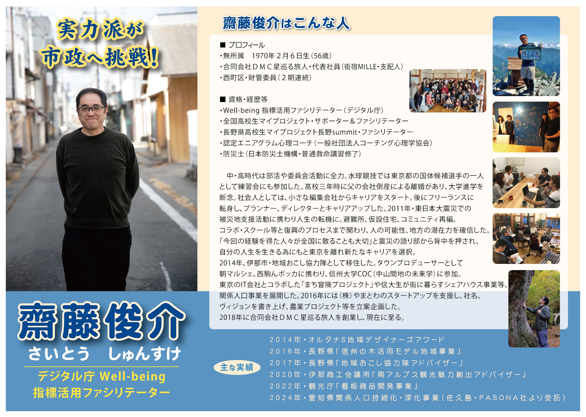2014年、伊那市・地域おこし協力隊として移住した。タウンプロデューサーとして朝マルシェ、西駒んボッカに携わり、信州大学COC(中山間地の未来学)に参加。東京のIT会社とコラボした「まち冒険プロジェクト」や大生が街に暮らすシェアハウス事業等、関係人口事業を展開した。2016年には(株)やまとわのスタートアップを支援し、社名、ヴィジョンを書き上げ、農業プロジェクト等を立案企画した。
