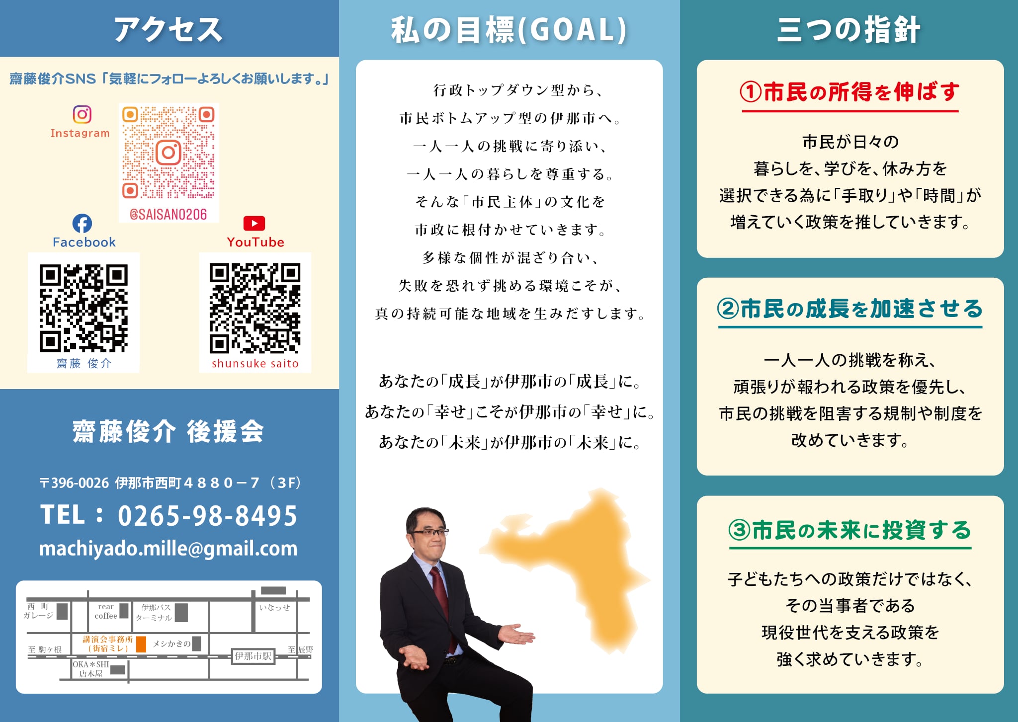 行政トップダウン型から、市民ボトムアップ型の伊那市へ。一人一人の挑戦に寄り添い、一人一人の暮らしを尊重する。そんな「市民主体」の文化を市政に根付かせていきます。
